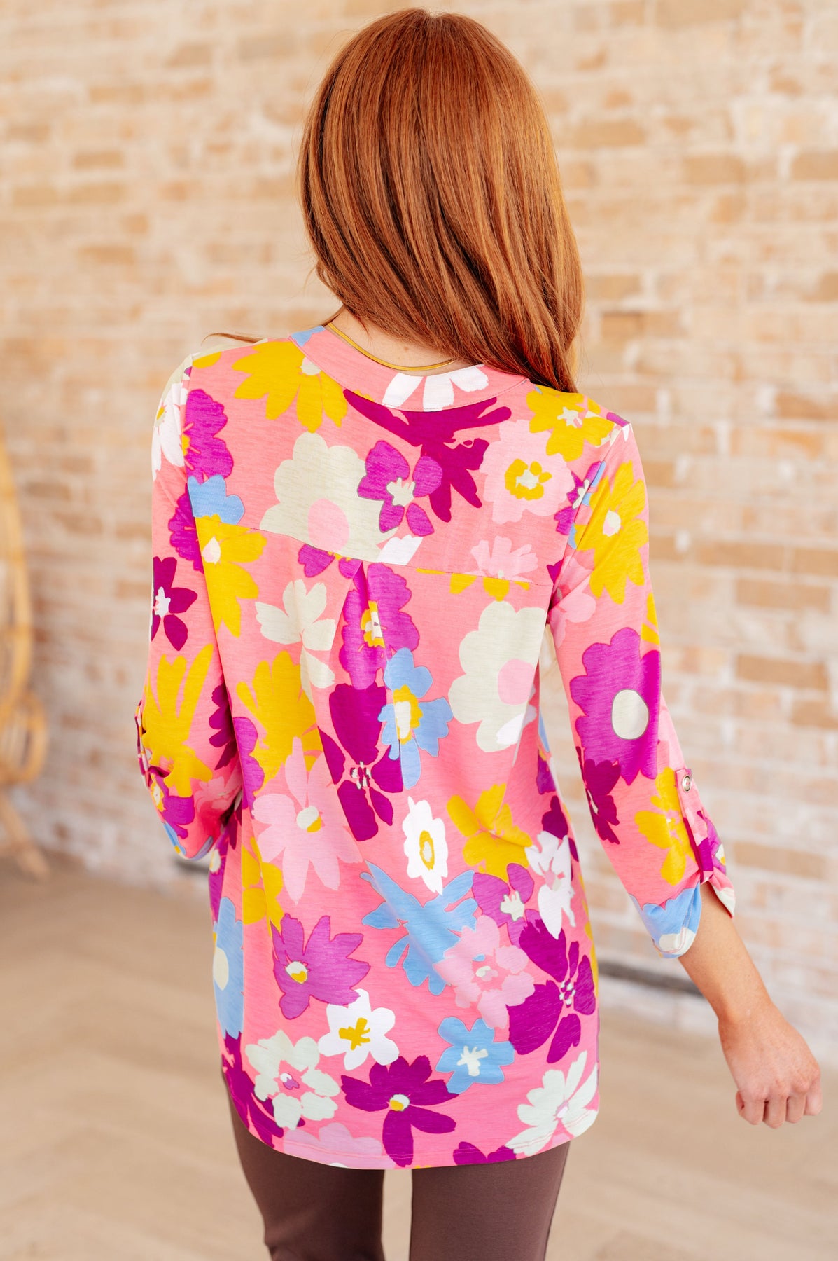 Transform your closet with the Lizzy Top in Aqua and Pink Paisley. Made from Bulgari, this top features a gabby neckline and button rolled sleeve tabs for a comfortable, yet eye-turning piece. The 3/4 sleeve and scoop hem add flow to the already stylish piece. Experience comfort and style in one with the Lizzy Top.