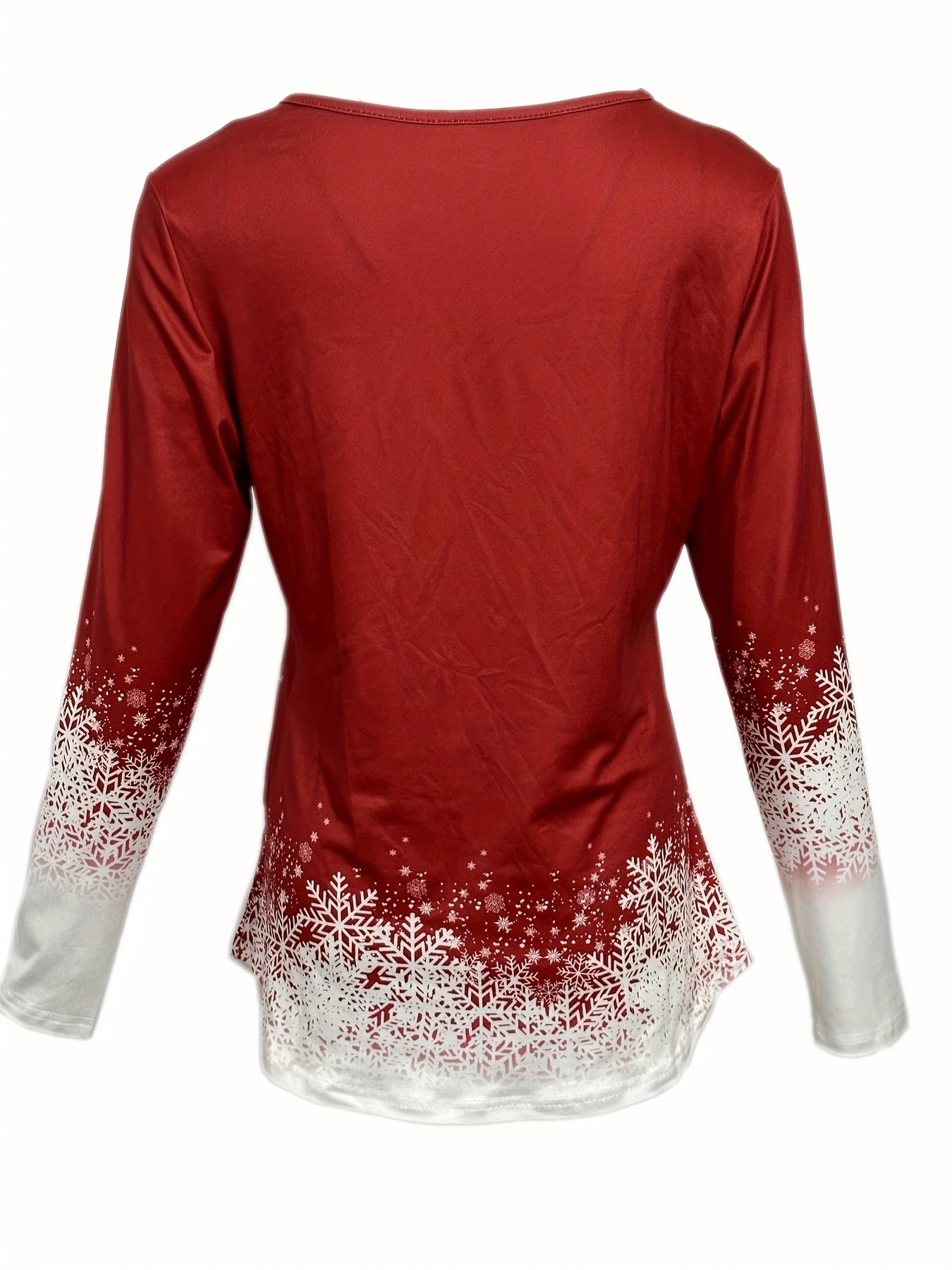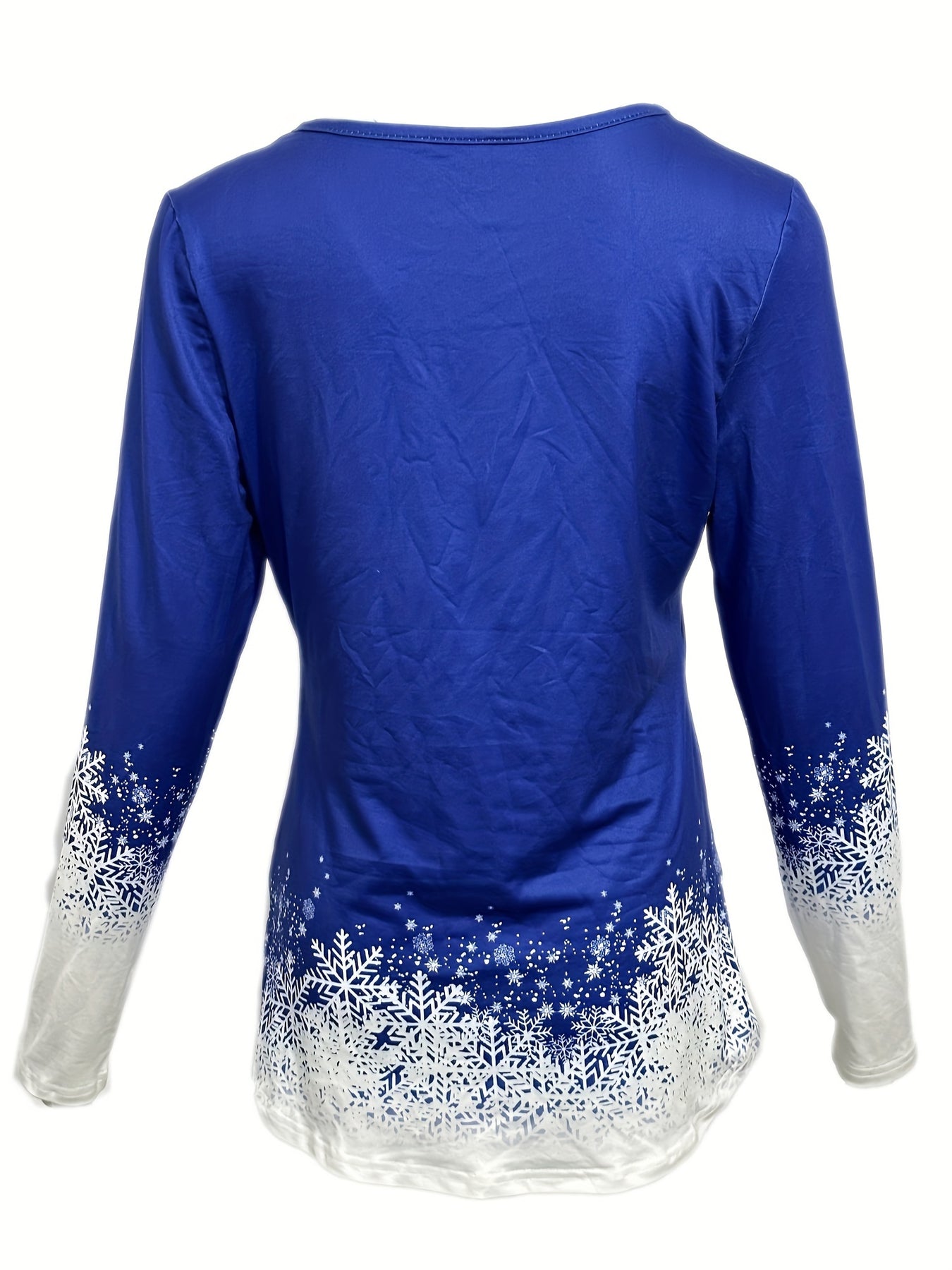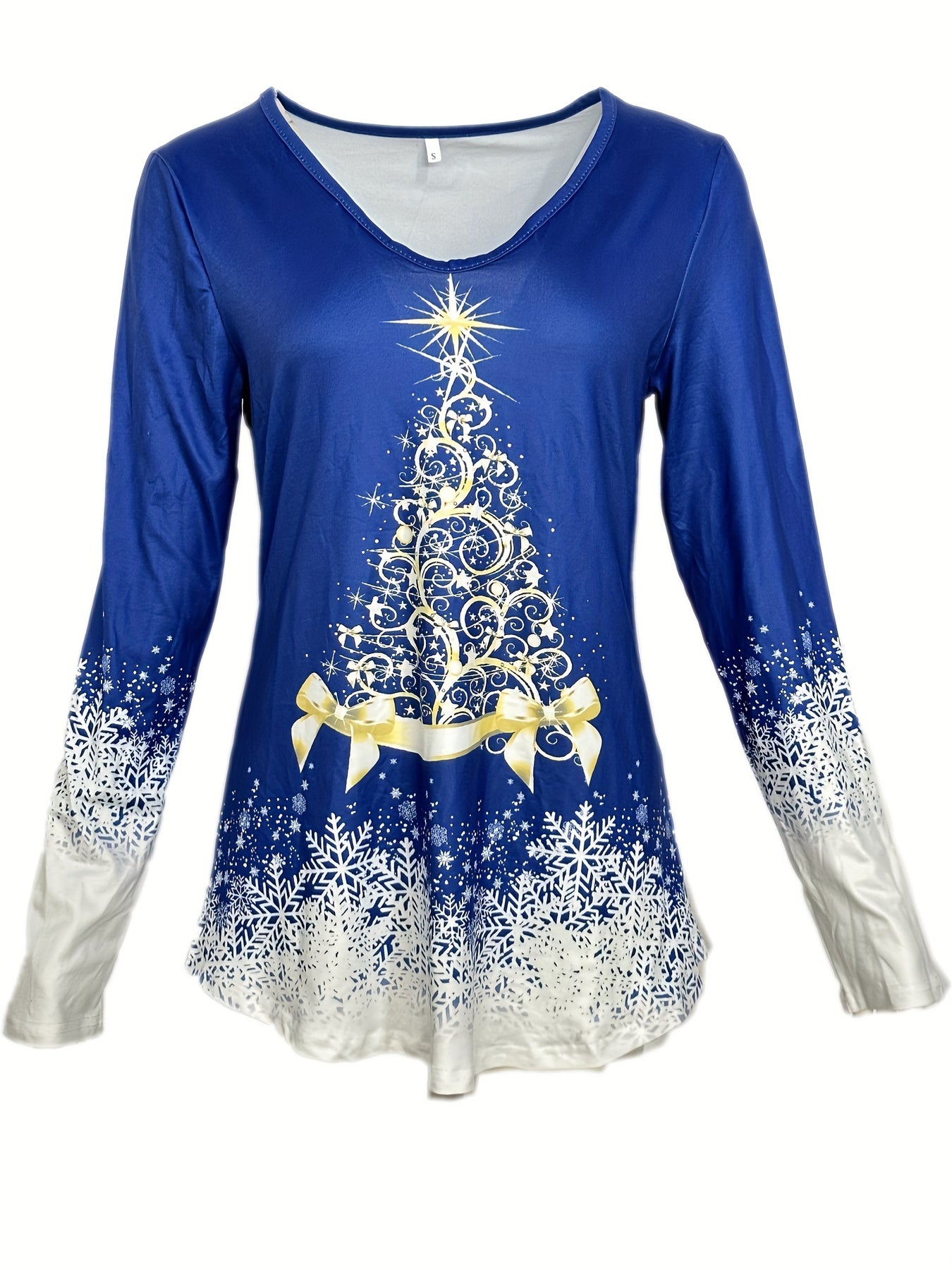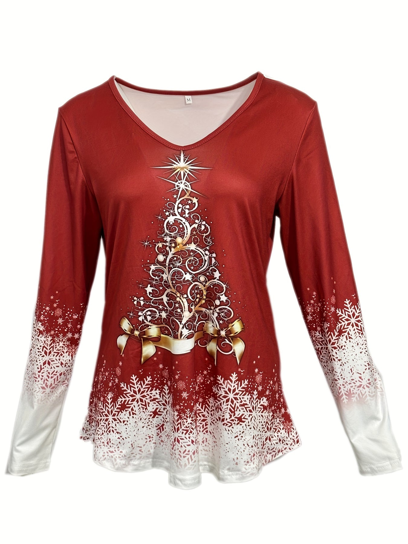 Christmas Graphic Print V Neck T-Shirt, Casual Long Sleeve Top For Spring & Fall, Women's Clothing