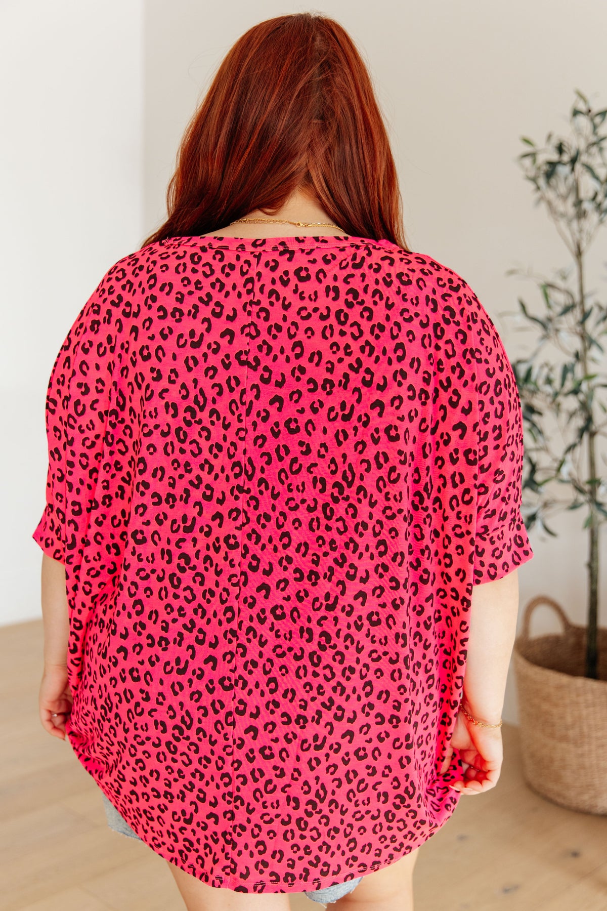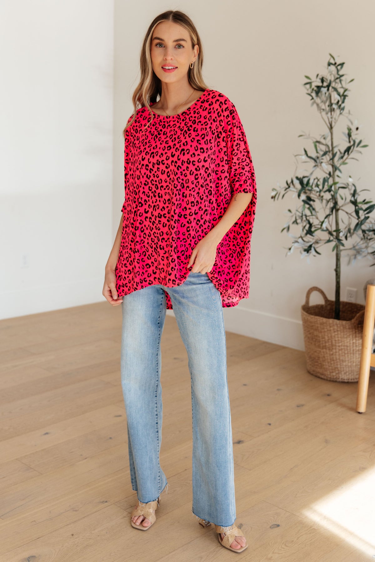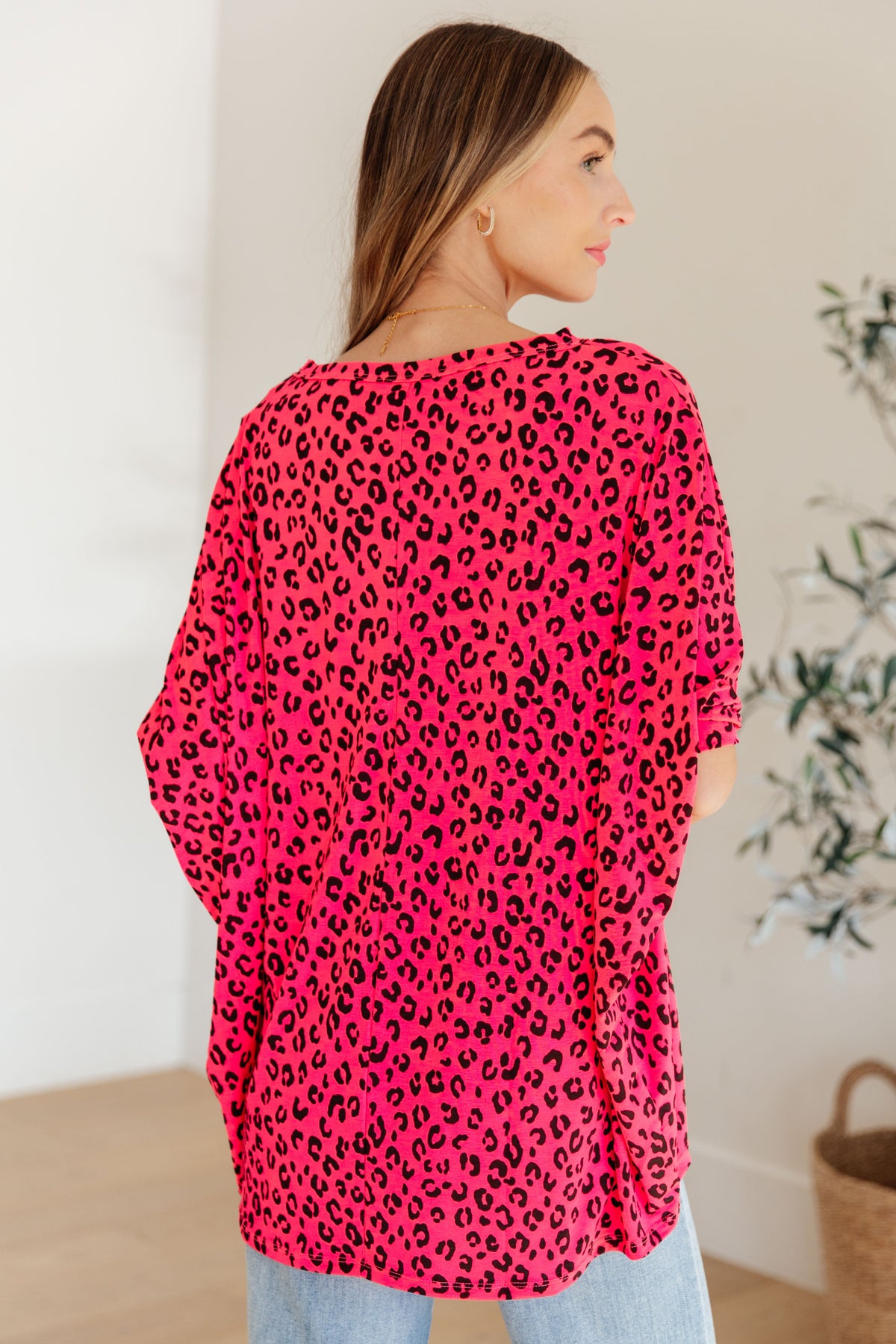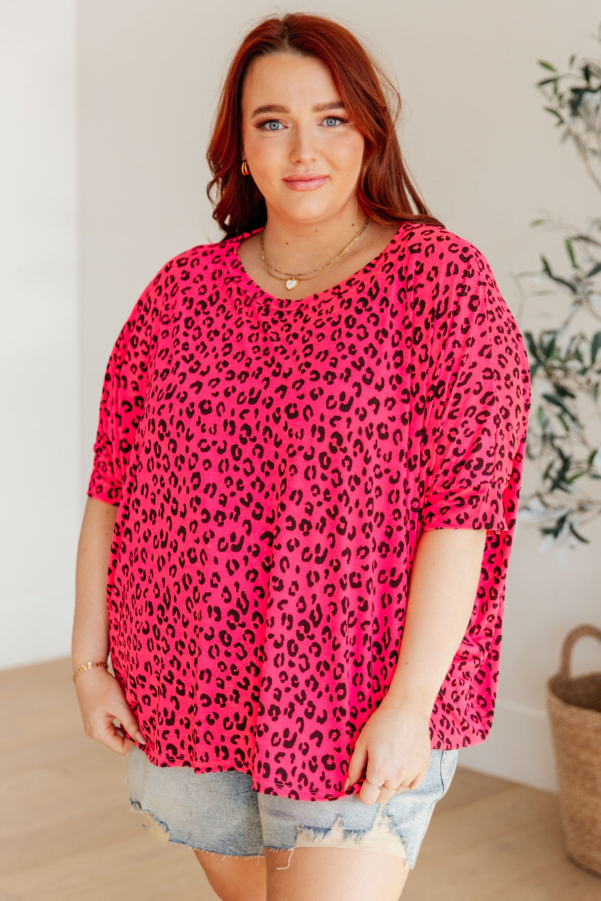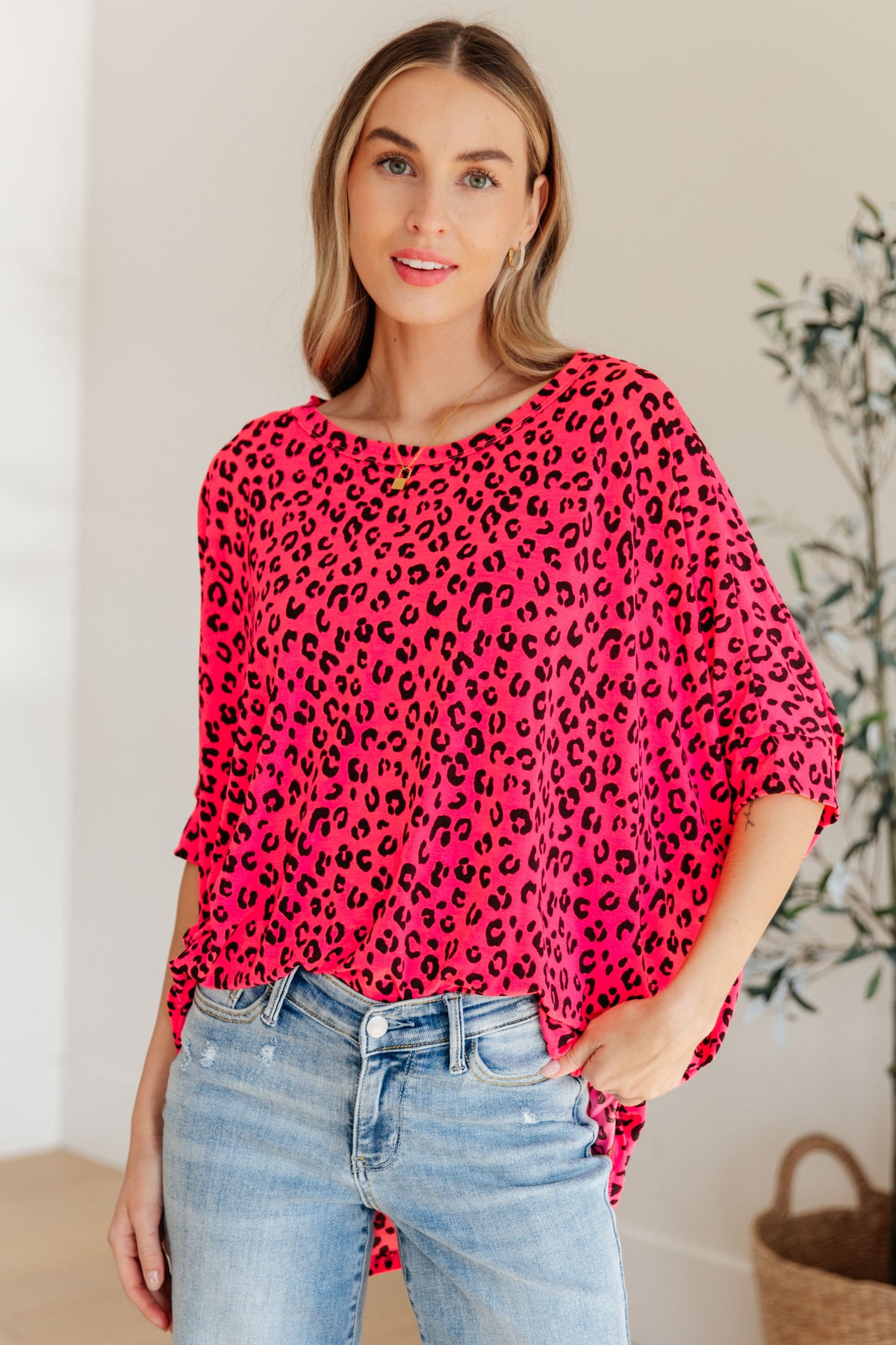 The Essentially You Top in Pink Leopard is the perfect blend of style and comfort. The boat neck and bat wing sleeve add a touch of elegance, while the high low scooped hem and banded sleeve cuff create a flattering silhouette. Made with bulgari fabric, this top is flowy, breathable, and oh-so-comfortable. (How can you resist?)