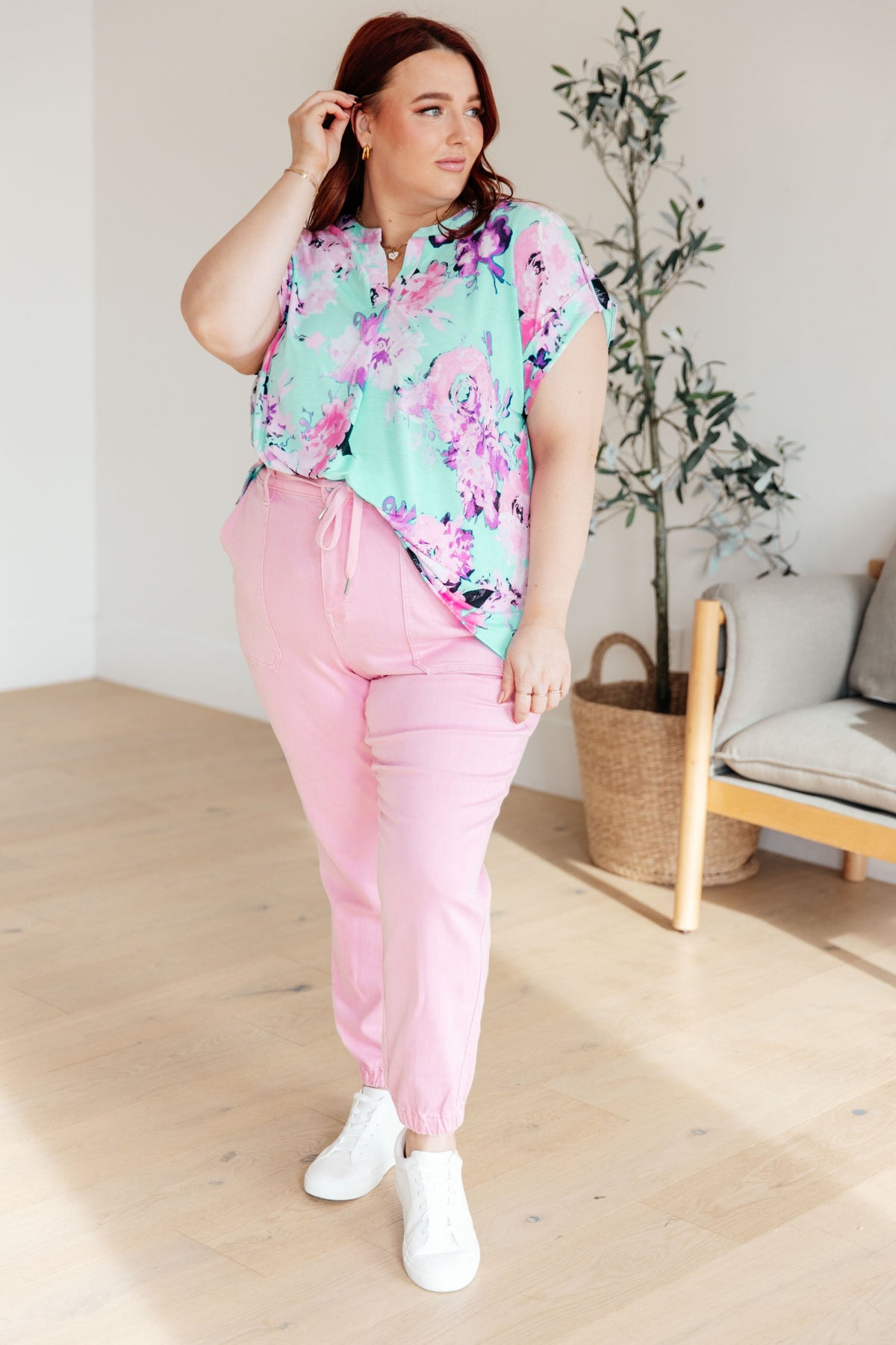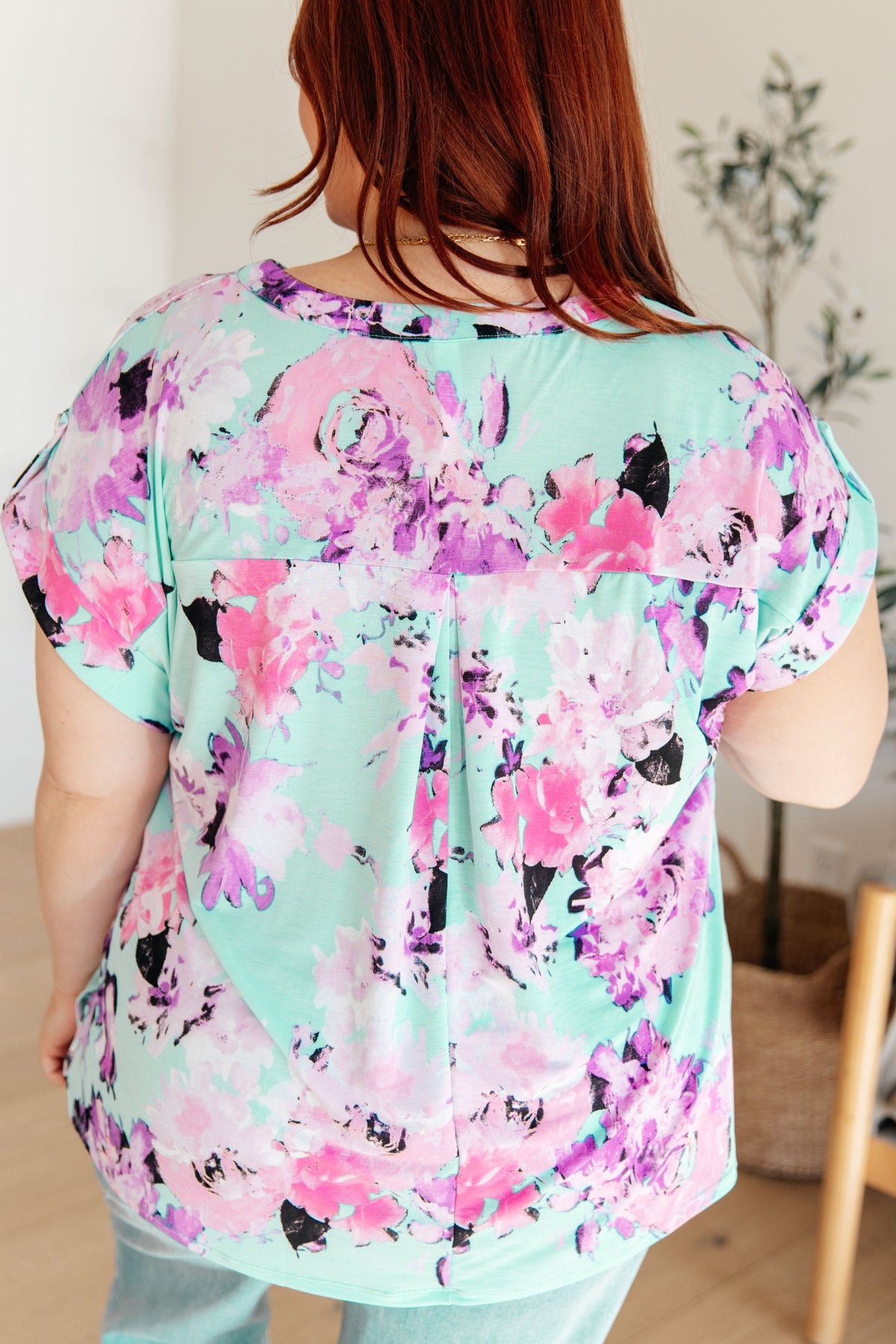 Revamp your wardrobe with the Lizzy Cap Sleeve Top in Lavender and Sky Floral. Crafted from Bulgari fabric, this top boasts a playful Lizzy neckline and button rolled sleeve tabs for a unique touch. The cap short sleeve and scoop hem bring a hint of flow to this trendy piece. Enjoy both comfort and style with the Lizzy Top.