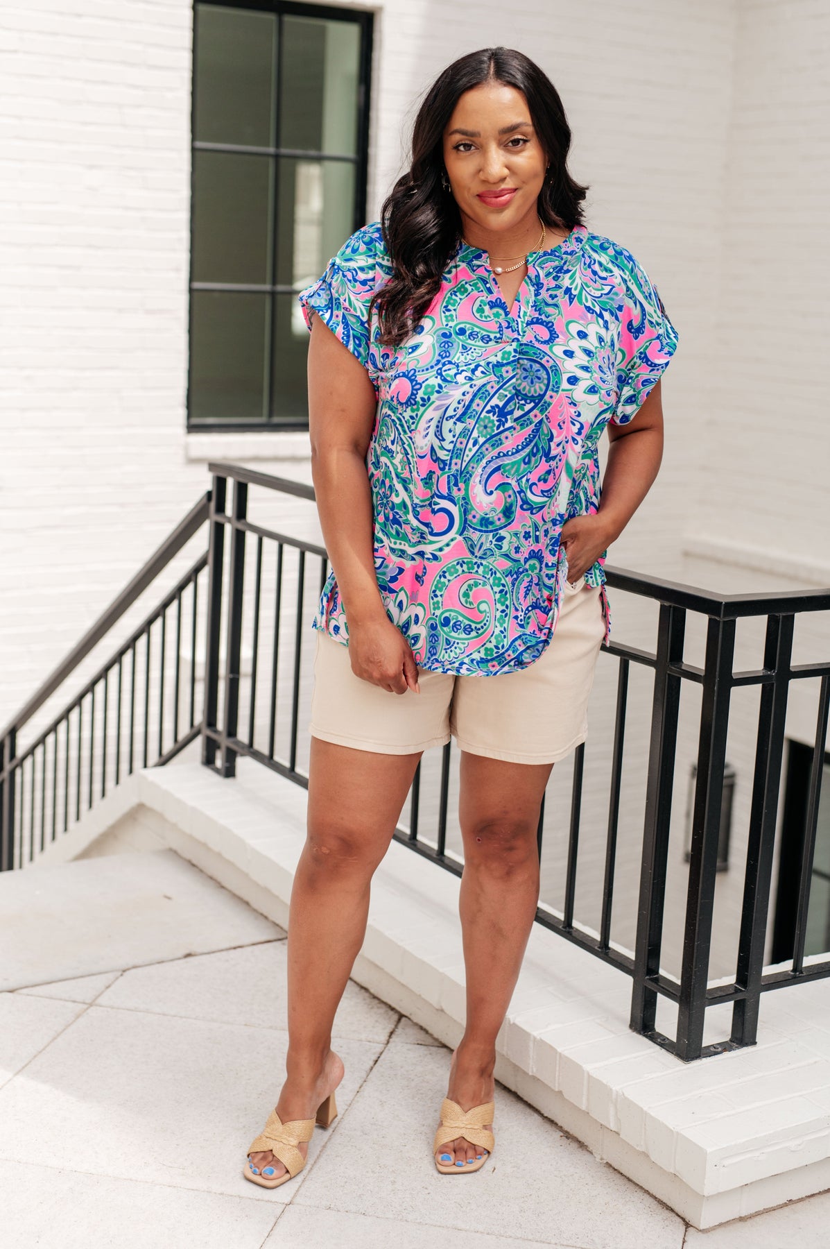 Lizzy Cap Sleeve Top in Pink and Jade Paisley Mix