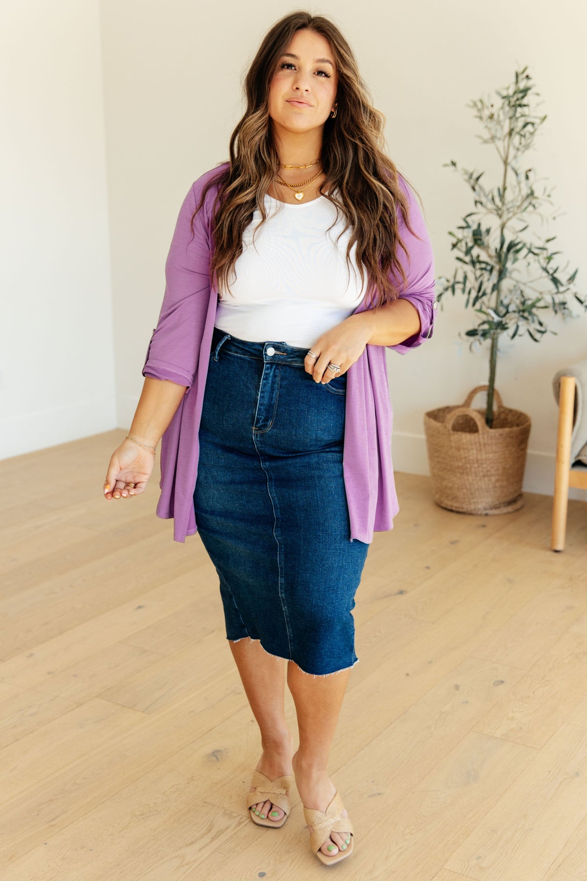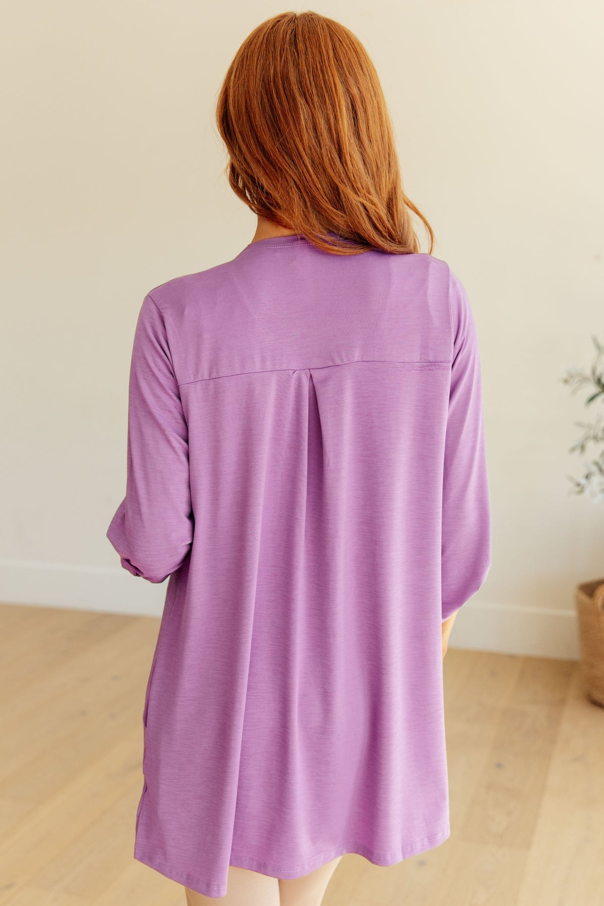 Introducing the Lizzy Cardigan in Regalia, the perfect blend of style and comfort. Stay cool with the Bulagri fabric and enjoy wrinkle-resistant and lightweight properties. Featuring faux button tab 3/4 sleeves, an open front, and a pleated back for a unique look. With functional pockets and a comfortable fit, this cardigan is a must-have. Order now for a fresh and playful look (and cozy comfort)!