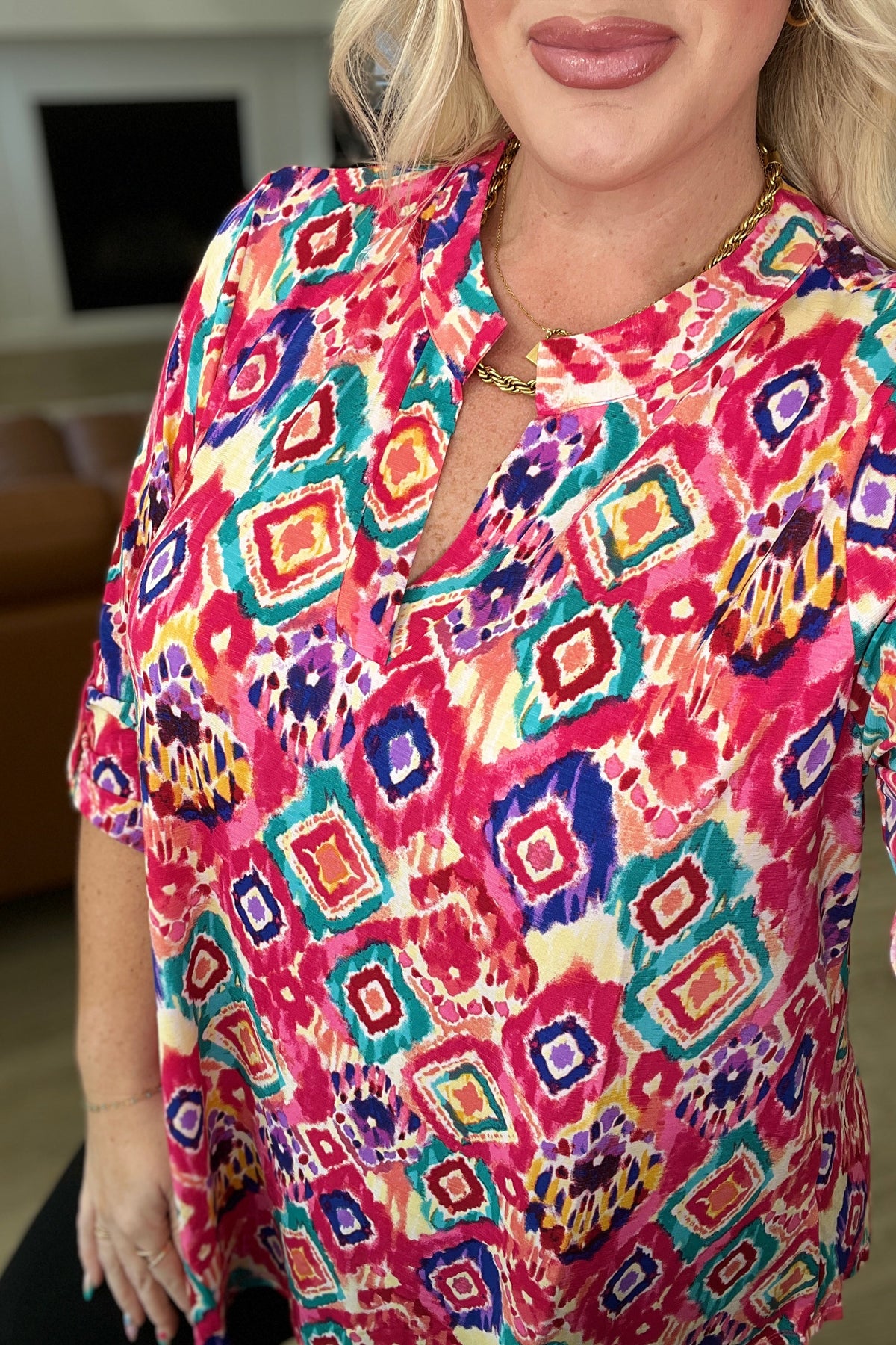 Transform your closet with the Lizzy Top in Hot Pink Ikat. Made from Bulgari, this top features a gabby neckline and button rolled sleeve tabs for a comfortable, yet eye-turning piece. The 3/4 sleeve and scoop hem add flow to the already stylish piece. Experience comfort and style in one with the Lizzy Top.