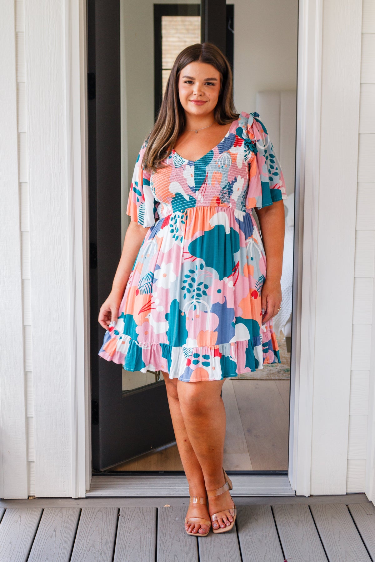 Turn heads in our Monet's Garden Floral Dress! This every occasion look features a smocked bodice, v-neckline, and beautiful large scale floral print with tiered skirt and ruffle details. Feel like a work of art in this easy to wear and utterly gorgeous dress!