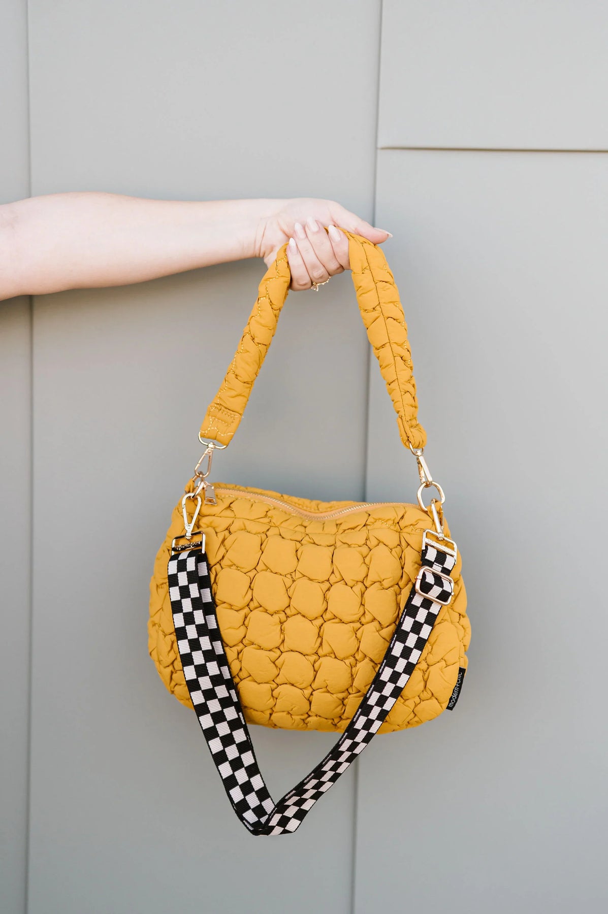 Big Yellow Taxi features the Alyssa in Mustard and the Lizzie Strap in Black. The strap adjusts from 25" to 50" end to end.