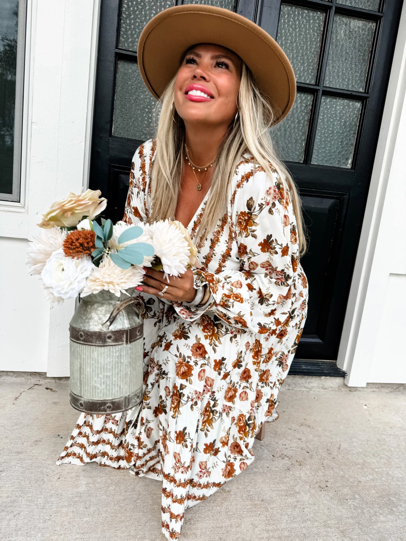 A floral dress like this one is a must-have for the Fall season. Beautiful details featuring a split arm cuff and matching neck and hem floral pattern.