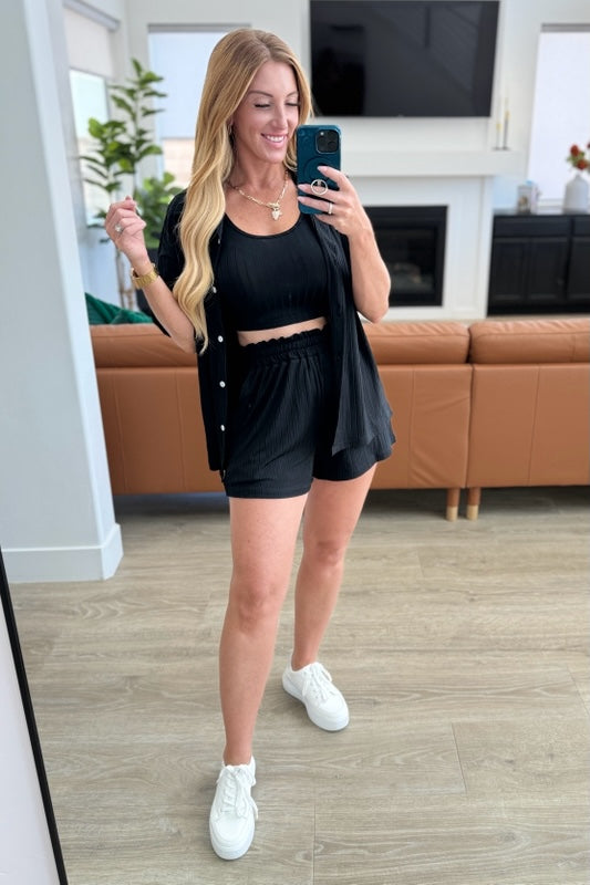 • Set includes: button-up oversized top, brami-style cropped tank, & elastic high waist shorts