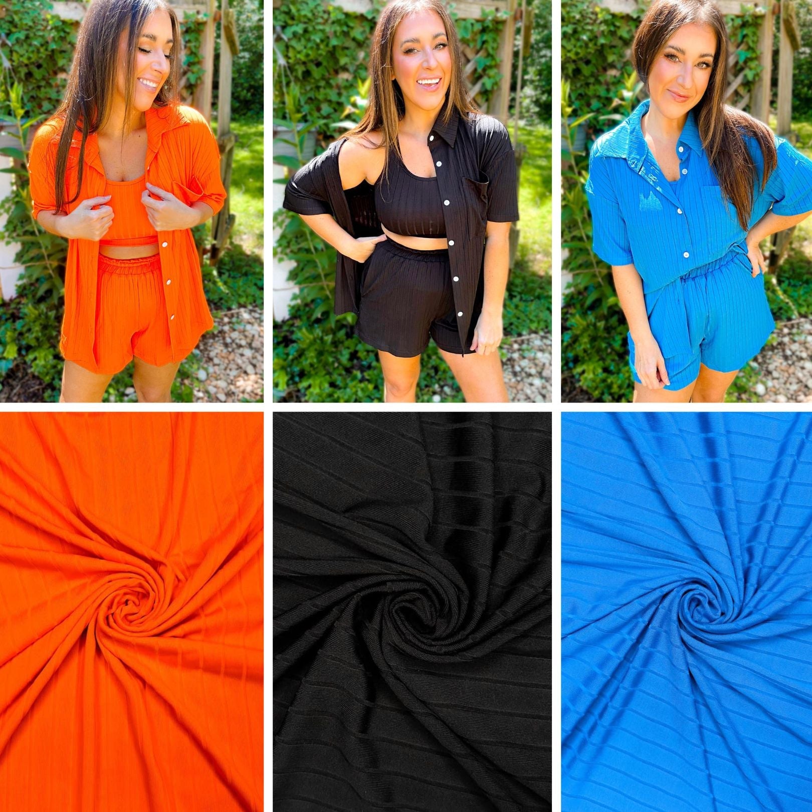 Our viral set that women all over social media are wearing is BACK & BETTER with a summer 2.0 update. New trendier design, same luxe fabric you fell in love with! This 3 piece sets boasts everything a girl could ask for! The fabric is ultra cooling, silky smooth, & stretches beyond belief. The new button-up & shorts design allows for multi-purpose wear whether you want to lounge around, need a beach cover, or a sophisticated matching set for date night.