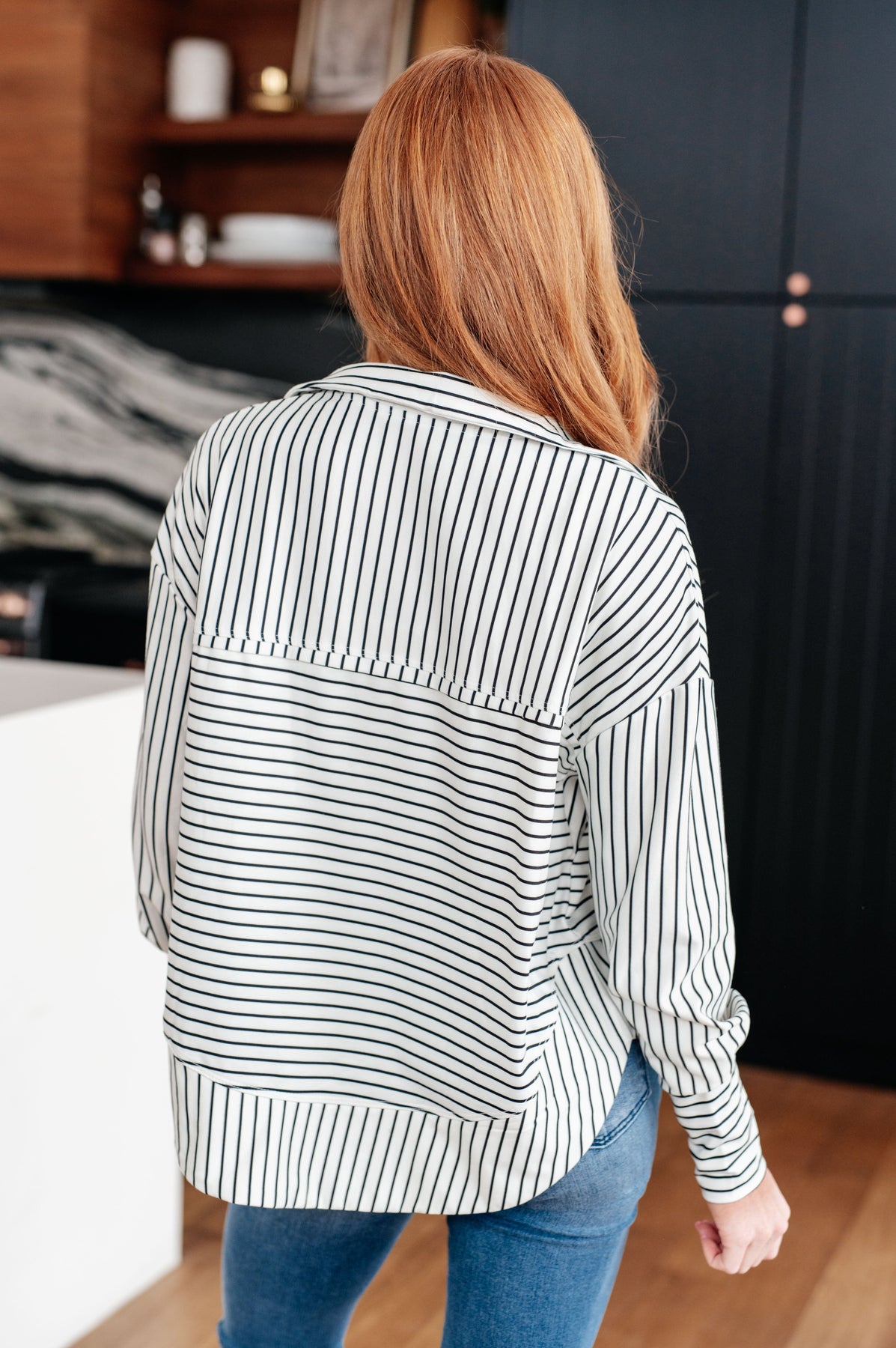 Serendipitously cozy, this Striped Serendipity Pullover features a collared neckline and exaggerated banded cuffs with grommet details. The thumb holes and scoop hem add extra function and flair to this playful jersey knit sweater. Perfect for a playful yet stylish look!
