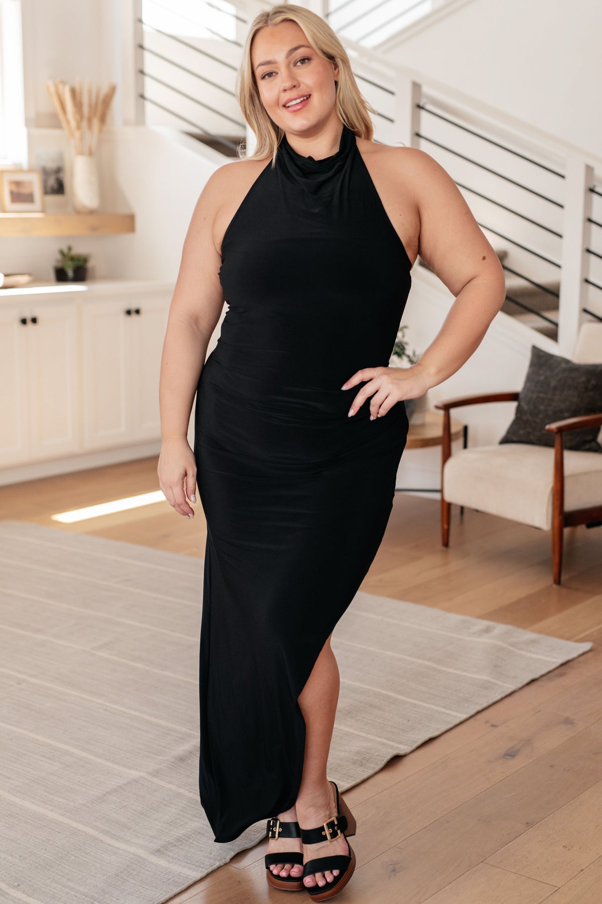 Our Table For Two Dress has a timeless look that will never go out of style! A lightweight slinky knit shapes a draped mock neck that wraps around the back creating a halter style with low back, dropping down into an asymmetrical maxi length skirt. This romantic dress is begging to be worn on your next date night!