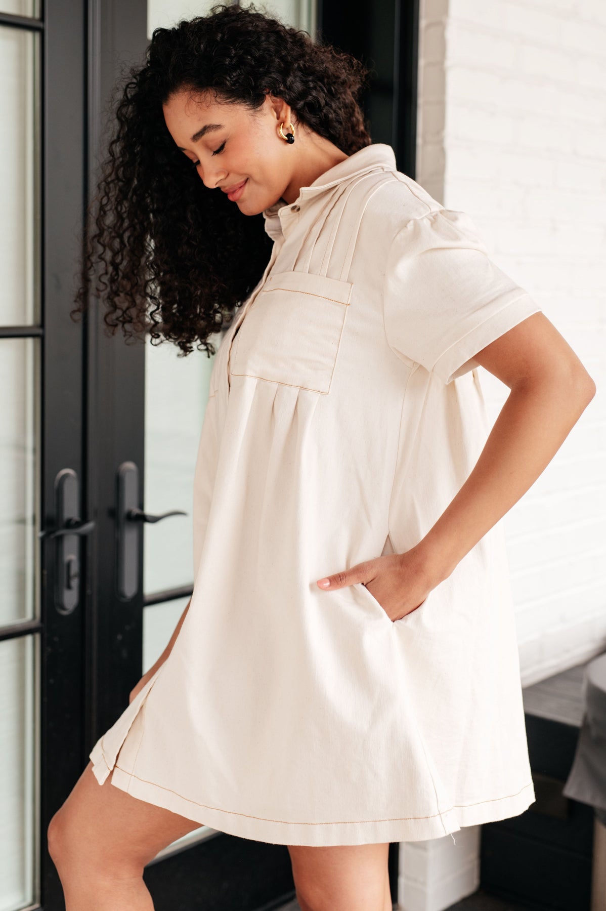 Get lost in poetic daydreams with our Tortured Poet Dress. This flirty cream-colored A-line dress features a collared neckline, functional button closures, and shoulder pleat details. Keep your essentials close with the front patch and functional side pockets. Finished with back pleats for added flair. Live out your literary fantasies in style on